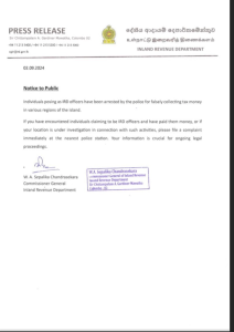 Issuing a statement, the IRD said that individuals posing as IRD officers have been arrested by the Police for falsely collecting tax money in various parts of the nation.